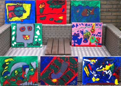 De kinderen kregen de opdracht om op canvas doeken van 30x40cm een achtergrond te schilderen, dit in hun favoriete kleur. Hierna moesten ze met de kleur zwart een tekening op het doek maken, dit naar eigen fantasie of wens. De tekening werd met complementaire kleuren van de desbetreffende achtergrond ingekleurd. Hierna mochten andere kleuren gebruikt worden om het geheel op te fleuren.